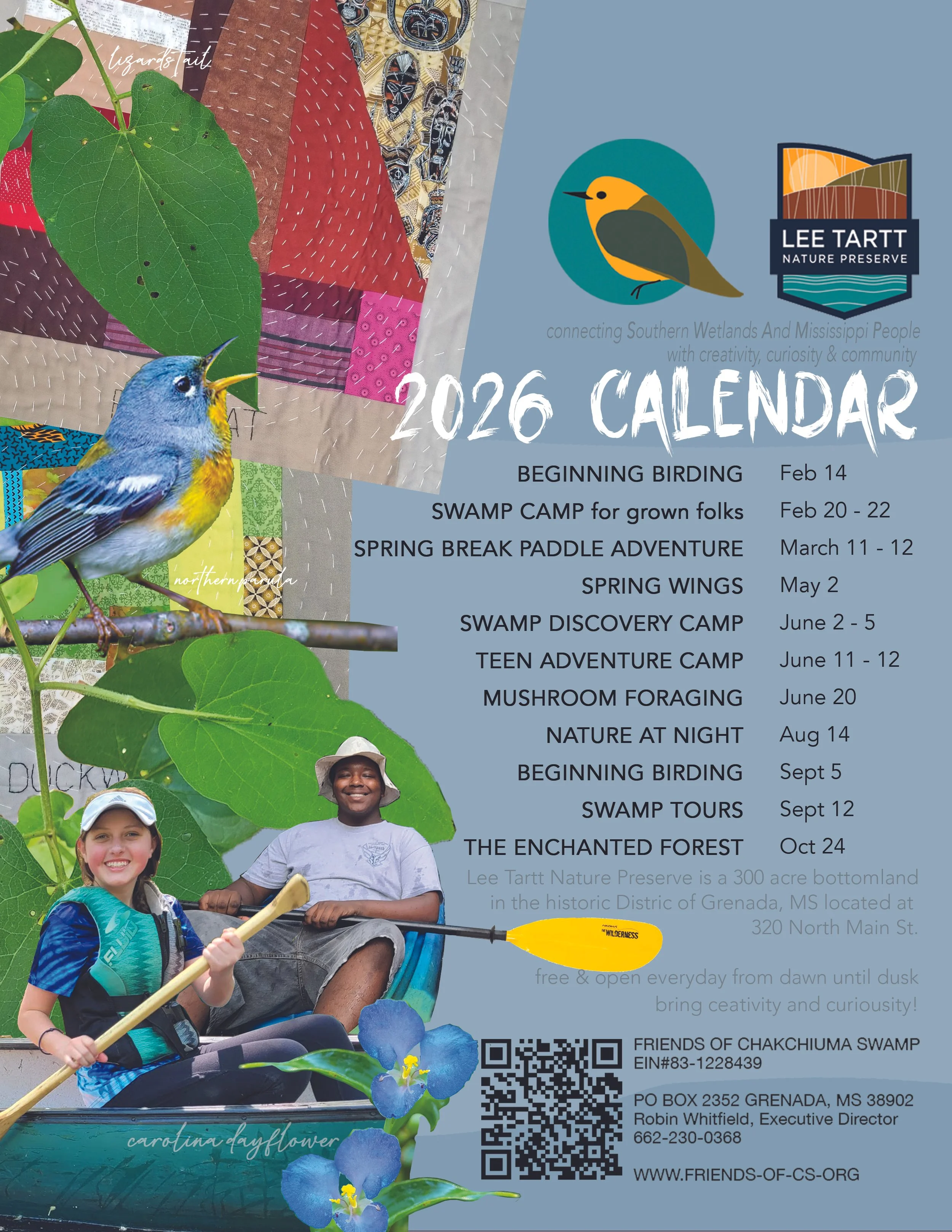 We hope you are a part of our year - hike our new trail, paddle in Chakchiuma Swamp (when it fills back up!), get creative at one of our classes, learn about bottomland species on a guided walk, volunteer for conservation work, or just sit on a bench in the shade and breath.